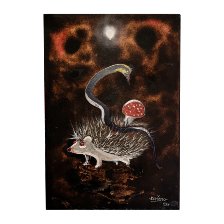 Рисовал я с детства, сколько себя помню, слова «играть» и «рисовать» были для меня равнозначными, но постепенно это забылось — в процессе моего профессионального развития в тату-культуре, к которой я пришёл в 18 лет. «Вспомнил» или окончательно осознал себя как художника я во время карантина в 2020-м, когда лишился плотного потока заказов на татуировки и остался один на один с своим «творческим зудом». Тогда я рисовал на всём и всем, что было в доме — потому что художественные магазины были закрыты, а доставка ещё не особо развита. Ощущения от работы были максимально комфортные, в чистых холстах я не нуждался, так как привык работать с нестандартными поверхностями, имеющими свою особую природу и историю, будь то кожа, стены зданий, заборы, ткани, доски и т. д.