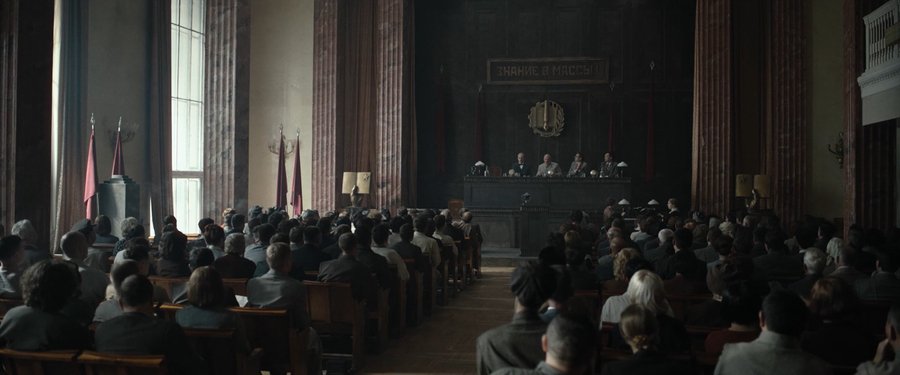 Фрагмент из фильма «Мастер и Маргарита», режиссер М. А. Локшин, 2024 / Конференц-зал в главном здании Российской государственной библиотеки, архитекторы В. Г. Гельфрейх, В. А. Щуко и др., 1928-1958
