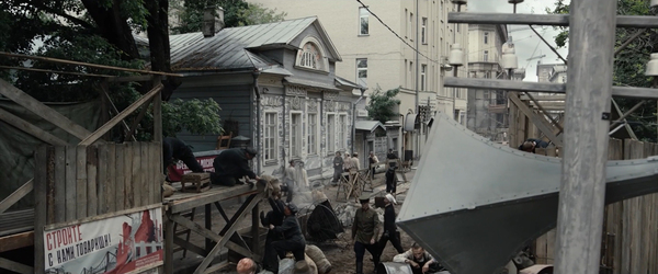 В левой части фрагмента можно заметить Дом советов, который находится на Московской площади в Санкт-Петербурге. Немного правее центра возвышается здание отеля Пекин, располагающееся в Москве. Первоначально оно создавалась с целью размещения главного управления лагерей НКВД СССР. За ним по высоким аркам можно узнать неосуществленный проект Наркомтяжпрома авторства Ивана Фомина. Его планировалось построить на Красной площади в Москве.