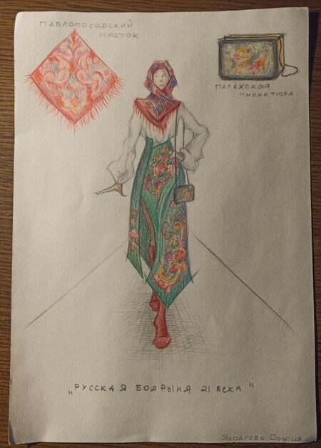 Образ «Русской боярыни 21 века» основан на идеи сохранения русской самобытности, культуры и применение традиционных НХП как уникальной особенности дизайна русских брендов. Этот образ был вдохновлен русскими сказка.Костюм состоит из шелкового Павлопосадского платка «Сказочные мотивы» темно-красного цвета, по которому сразу можно узнать всякую русскую красавицу и прекрасно дополнить им любой образ. Тонкая льняная рубаха свободного кроя с расширяющимися к запястью рукавами, напоминающими образ царевны-лебедь из «Сказки о царе Салтане», придает образу легкость и воздушность.На модели надета длинная юбка треугольной формы с запахом, похожая на платок, с интересным разрезом до бедра, чтобы не скрывать от окружающих изящность и качество русских красных сапог, который также акцентами перекликаются с платком на голове. Образ завершает предмет традиционного нхп — миниатюрная роспись по мотивам сказки о «Жар-птице», изображенная на сумке минодьер, подвешенной на тонком ремешке из кожи. Особенность этой сумке в том, что она содержит в себе Палехскую миниатюру, не имеющую аналогов во всем мире и всегда иполняющуюся вручную.