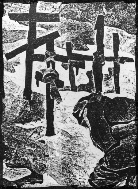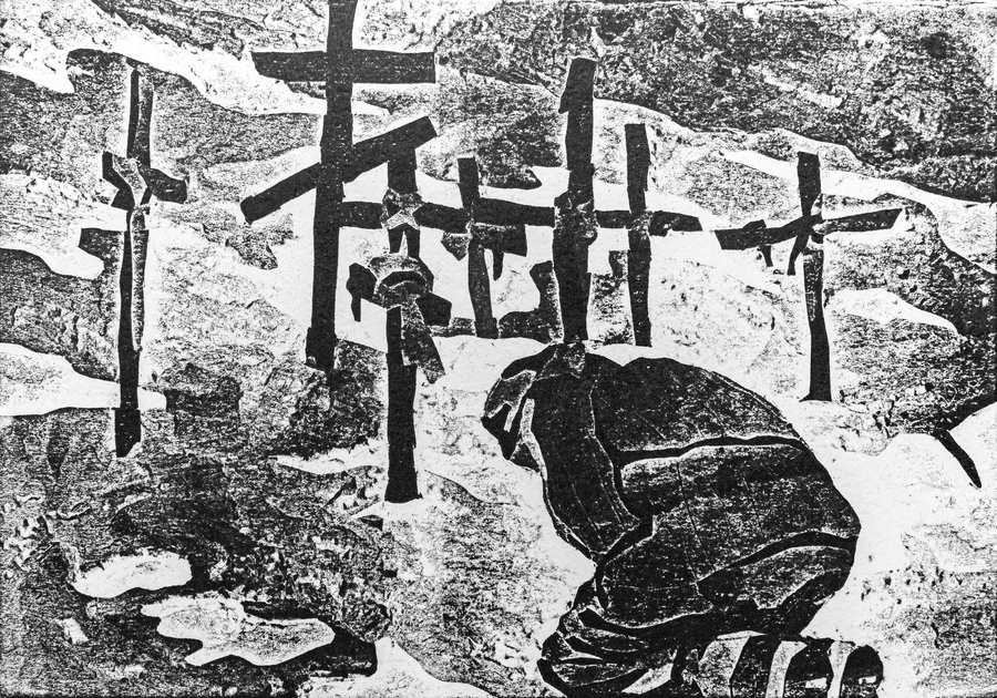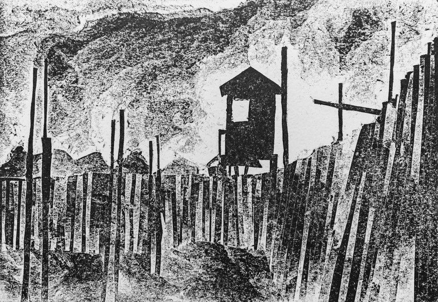 «Лагеря», ¾, Гравюра на картоне, 28×19 см, 2024