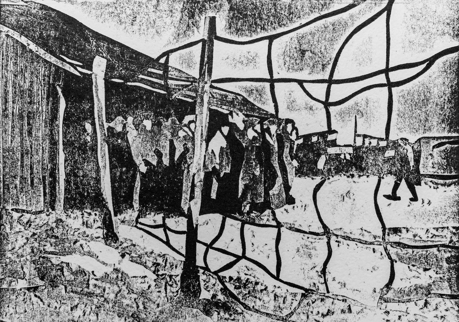 «Лагеря», ¼, Гравюра на картоне, 28×19 см, 2024