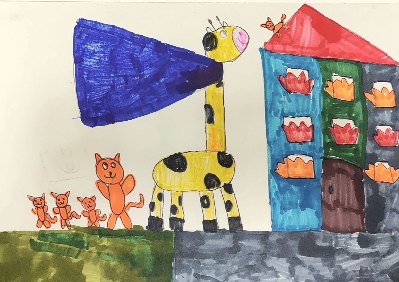 Жираф супергерой спасает семейство кошек. Афанасьева Василиса. 7 лет.