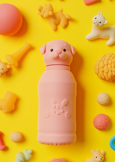 3d render photo with pink bottle in the shape of dog, the bottle cap is made of matte plastic. yellow background, different toys for dogs around, photo from the top --ar 3:4