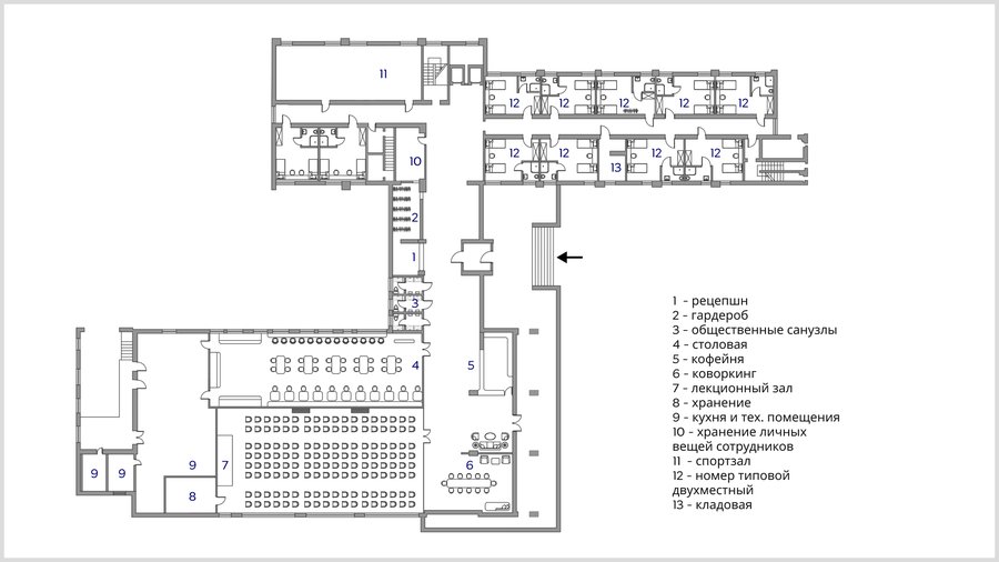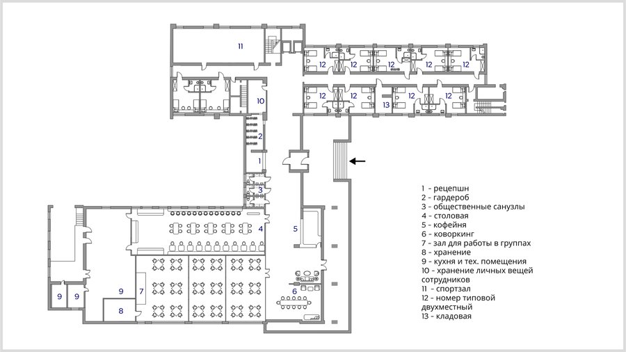 Решением стало проектирование образовательного центр курортном городе с комфортным размещением и большой зоной для проведения мероприятий, стратегических сессий, хакатонов