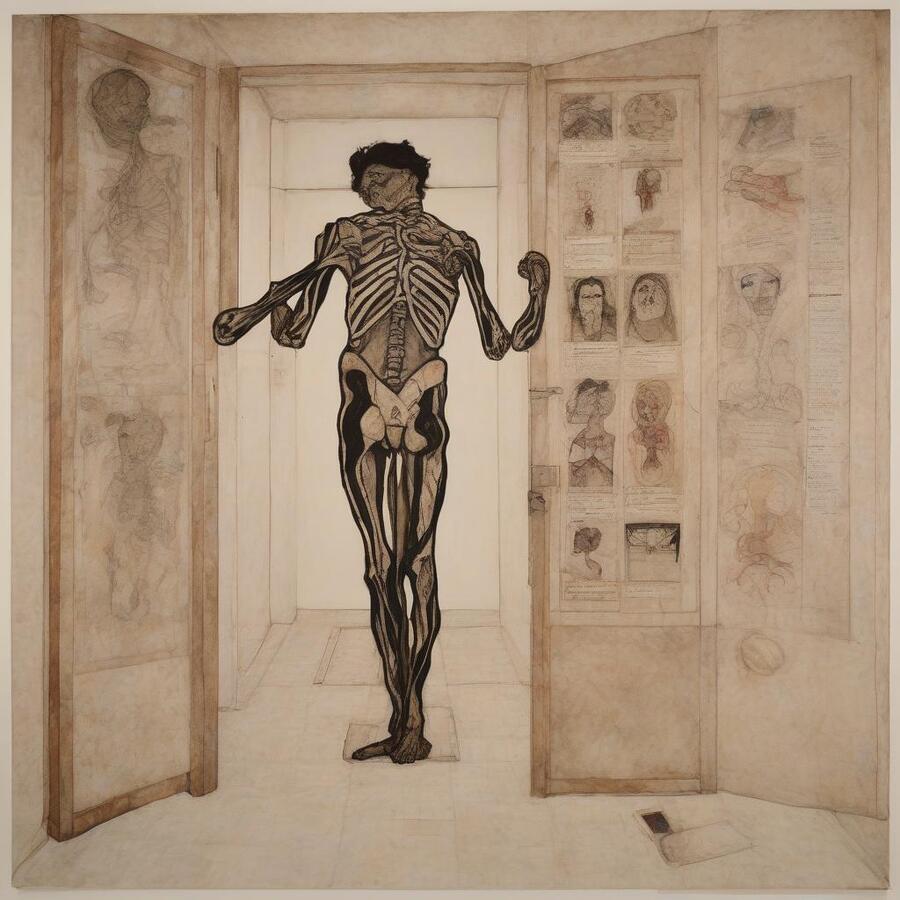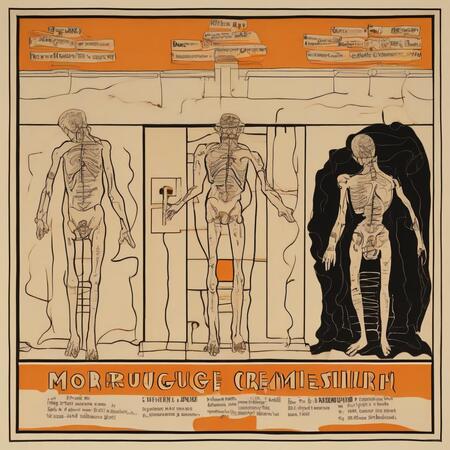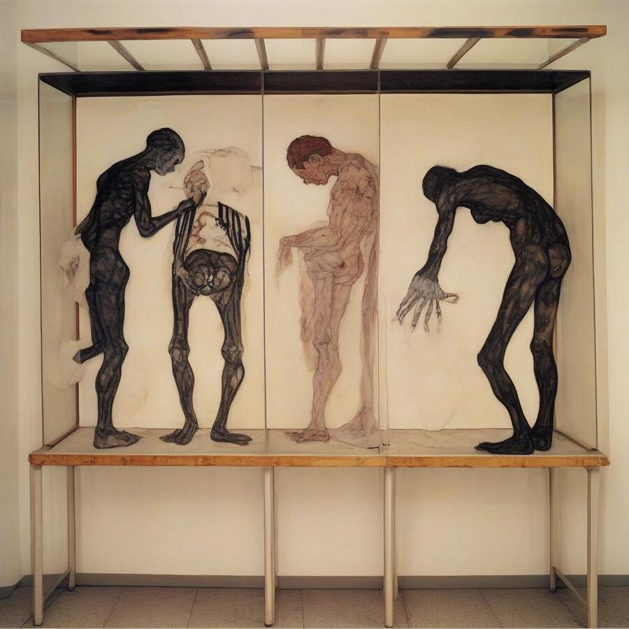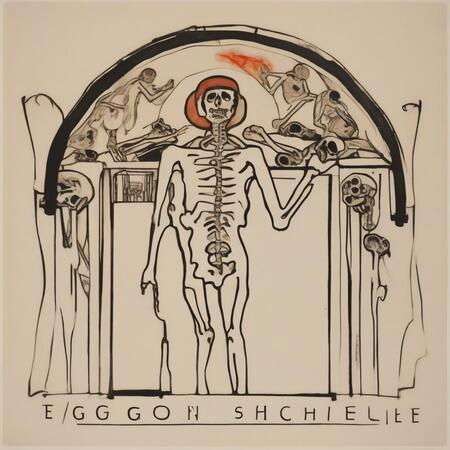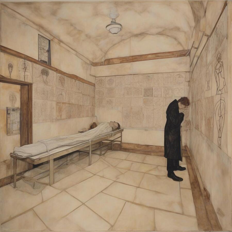 Промт: Egon Schiele’s morgue-crematorium is filled with pentagrams, paintings, urns with ashes and an atmosphere of death. He paints portraits of sinners and their soul stays there forever.