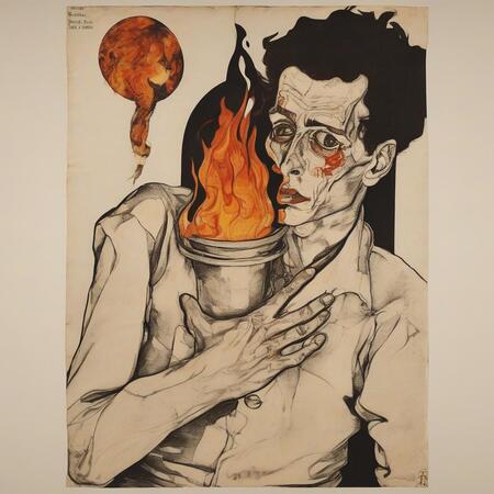 Промт: The monastery of Egon Schiele is a place for all sinners. There are a lot of fire and corpses around, a lot of fire and the spirit of death.
