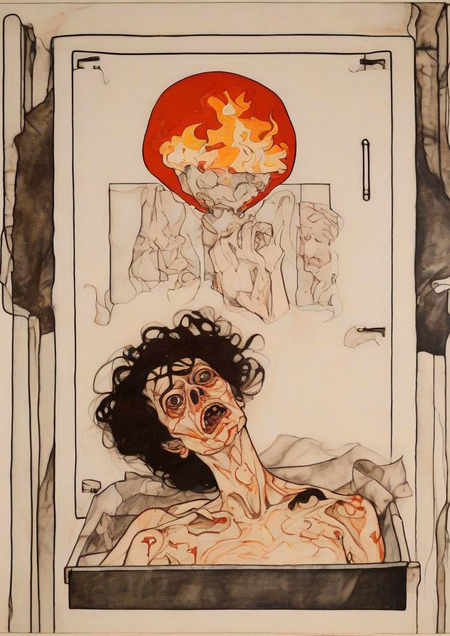 Промт: vector graphic pattern in the style of Egon Schiele. With fire and corpses