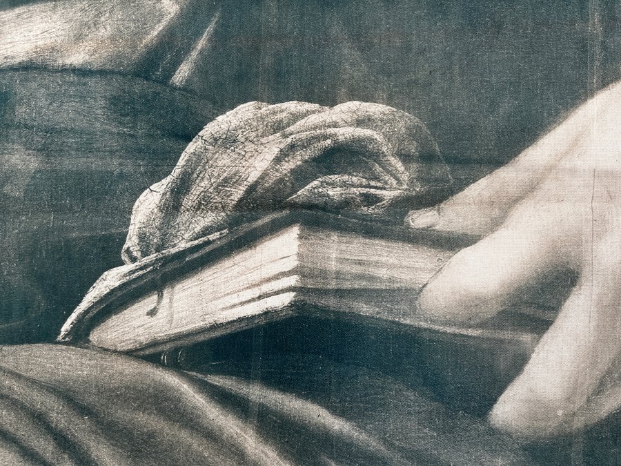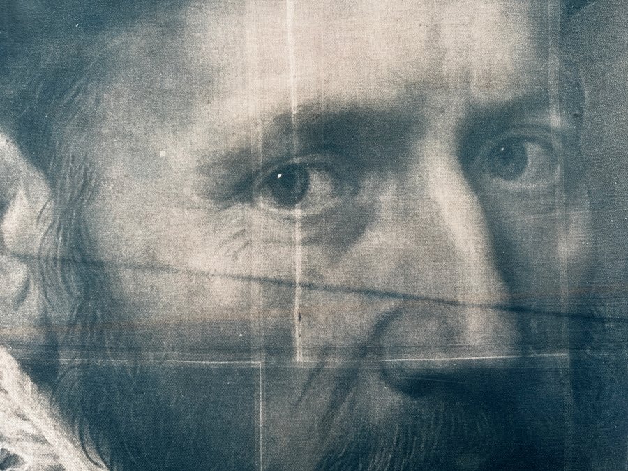 Проявление изображения на ткани с помощью цианотипии и последующей обработкой крепким чайным раствором.