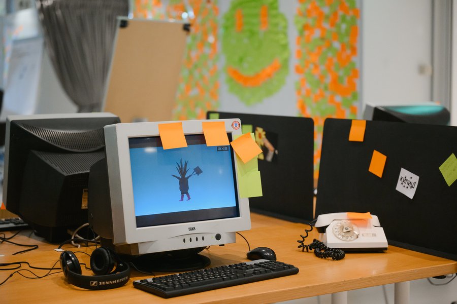 На сценах «Офис» и «Комната отдыха» стояли телевизоры, на которых можно было смотреть мультики от 2×2.
