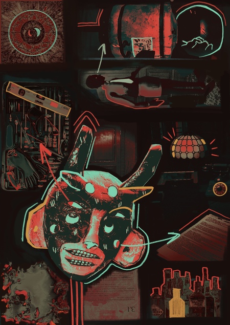Помимо интерактивных объектов еще можно встретить наблюдателей — чертей в масках, которые помогают перемещаться по локации и находить новые предметы для взаимодействия.