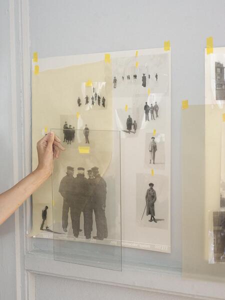 Это состояние зафиксированности, срединное положение между мгновением и вечностью находит свое визуальное воплощение в проекте «Окна», составленным из архивных снимков и фотографий, снятых во время пандемии. Художница комбинирует современные и исторические портреты жителей Гааги, размещает полученные прозрачные коллажи на окнах, и фиксирует взаимное наложение персонажей и опустевшей городской среды. С помощью такого формального метода настоящее и прошлое сталкиваются, сосуществуют в общем безлюдном затвердевшем пространстве.