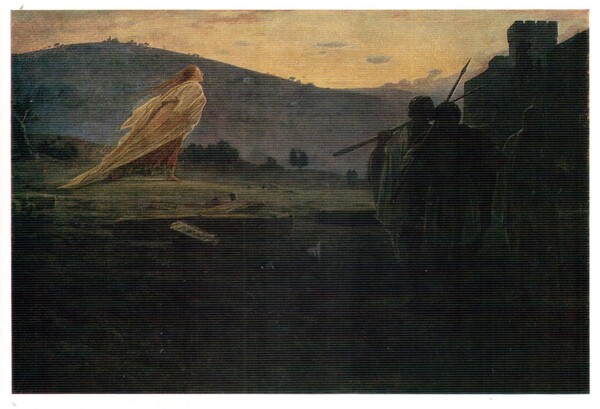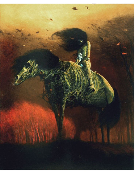 На следующих полотнах мы можем наблюдать яркие образы-вестники. В случае с образом, созданным Ге, он видится нам конкретным и нарративным, соответствующим библейскому сюжету, а фигура на коне с картины Бексиньского снова сюрреалистична и нелогична. Полотно вновь таинственно, в отличие от картины Ге, которая рассказывает конкретную и знакомую зрителю историю. Работа Бексиньского же не привязана ни к какой истории, не имеет названия, однако складывает у зрителя впечатление встречи с мистическим вестником.