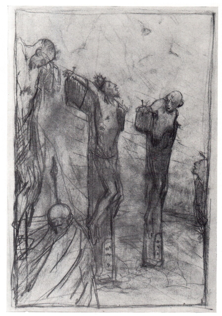 Перед тем, как приступить к анализу полотен Николая Ге из его «Страстного цикла», нам следует обратить внимание на эскизы и зарисовки, предшествовавшие им. Они играют немаловажную роль в поиске нужных нам смыслов и образов. Так, по своей форме эскизы не просто служат прототипом и черновиком, а в полной мере определяют будущие работы и их форму — прерывистость и лихорадочность движений руки берут свое начало в набросках и продолжаются в «завершенных» полотнах.