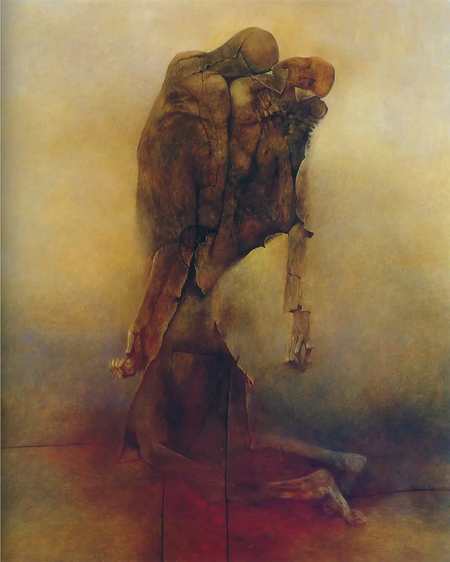 Образы на полотнах обоих художников все еще исполнены печалью и агонией. Стоит сравнить эскиз «Головы Марии» и картину Бексиньского с двумя аморфными фигурами, на которой одна из них оплакивает другую. Сожаление и боль, выражающиеся в первом случае в реалистической манере изображения портрета, а во втором — в динамичности и ломанности образов в обоих случаях имеют сходство в цветовых решениях — охристые цвета затемнены, дополнены красными оттенками, которые усиливают ощущение страданий и крайней степени боли, а в случае с картиной Бексиньского обозначают кровь, по наличию которой мы можем судить о живой природе изображенного существа.