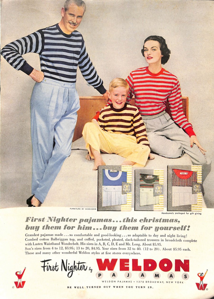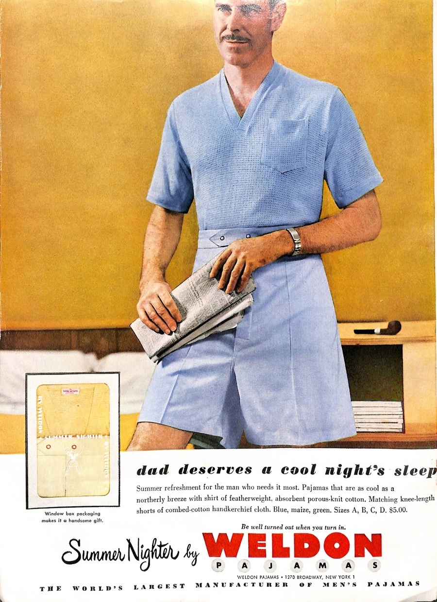 Реклама мужских пижам Weldon. Summer Nighter. Woman’s Day, июнь 1951 // Today’s Woman, декабрь 1952
