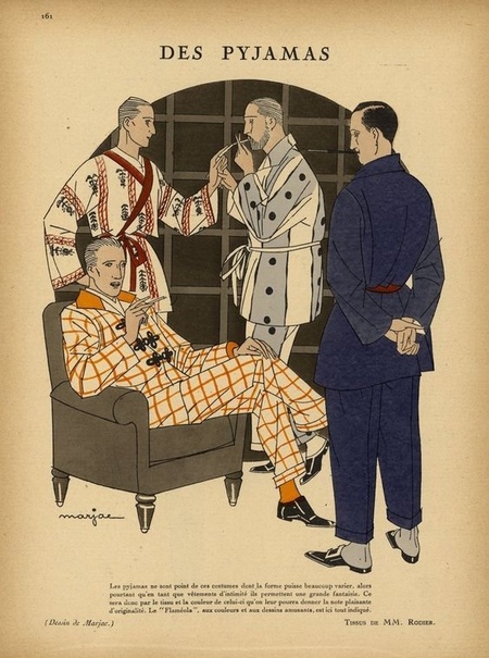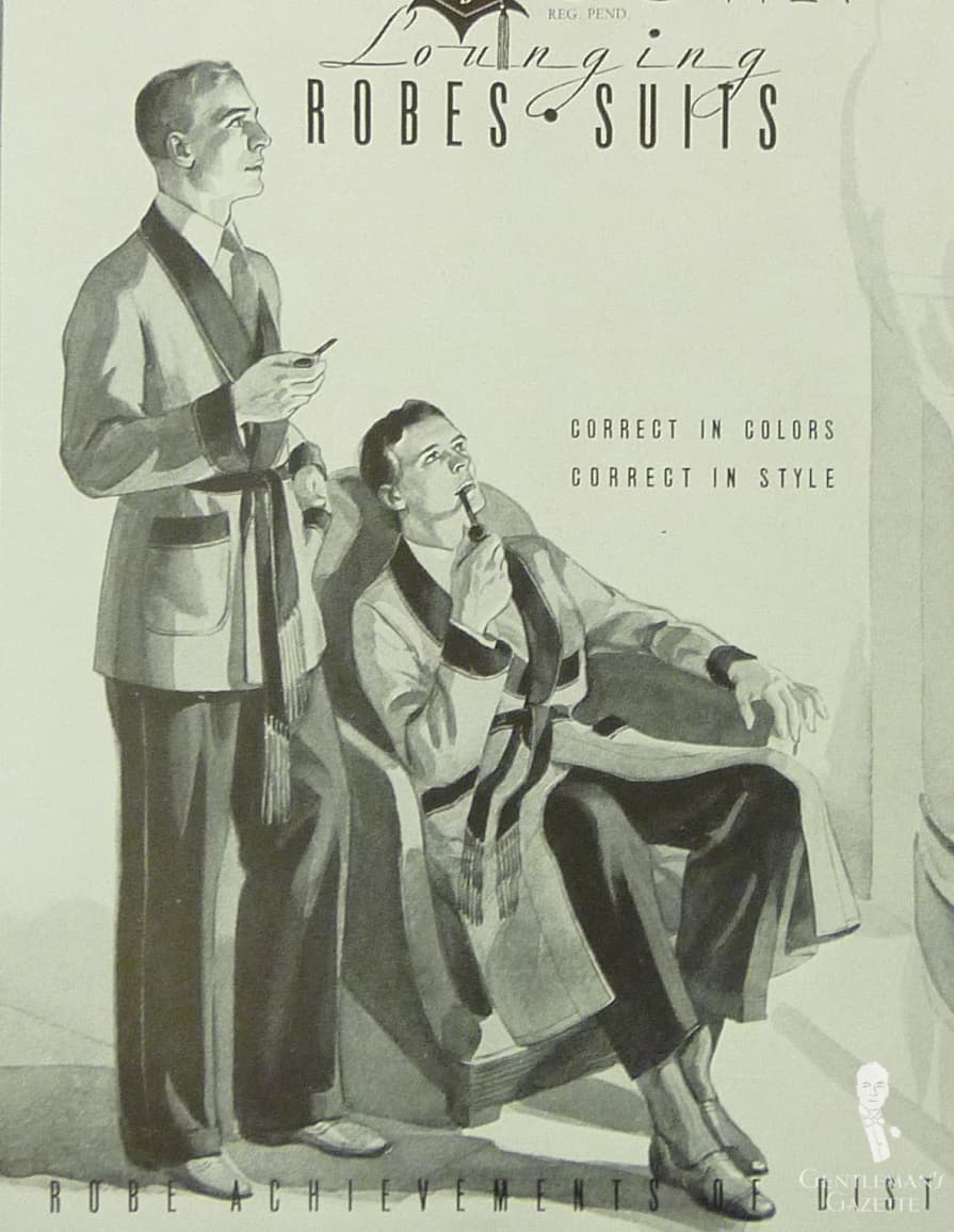 Во Франции и Великобритании начинают активно развиваться домашние коллекции prêt-à-porter. Например, французские компании Le Slip Français и Le Bon Marché в этот период вводят серийное производство мужского белья и пижам, ранее считавшихся предметом индивидуального пошива. В журналах «L’Officiel» и «La Mode Illustrée» появляются советы по подбору «удобной и изящной одежды для дома», где халаты из шерсти или фланели позиционируются не только как вещь для отдыха, но и как часть «современного мужского вкуса».