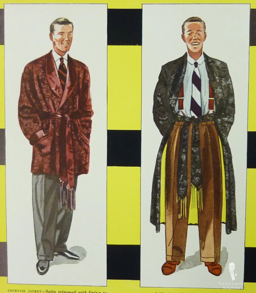 Параллельно в моду входит так называемый «smoking jacket» — короткий домашний пиджак, вдохновлённый вечерними костюмами, но предназначенный для отдыха. Он сочетал элегантность с практичностью и стал визуальным символом обновлённой приватности.