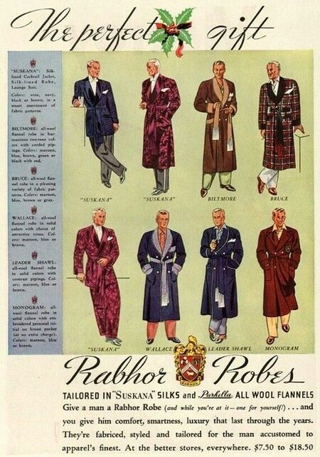 Параллельно развивается рынок ready-to-wear и каталогов. Компании Sears, Montgomery Ward, Arrow, Jockey и Van Heusen выпускают рекламу, где мужская домашняя одежда становится признаком цивилизованности, успеха, хорошего вкуса. Пижама или халат из шёлка в рекламном буклете 1940-х — это уже не привилегия элиты, а достижимый стандарт среднего класса.