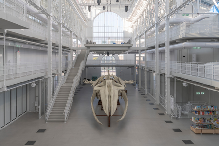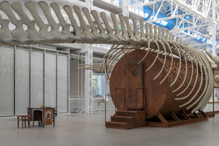 Наверное, стоит начать с перформативной инсталляции «52 Гц»56. Название является своеобразной отсылкой к самому одинокому киту, который единственный живет на чистоте в 52 Гц. В виде огромного скелета, он появляется еще и как инсталляция, взятая то ли из музея естественной истории, то ли из японской мифологии. Внутри него спрятана цистерна, где и происходит аудиоспектакль. Это своеобразный вырванный из реальности остров, в который можно войти только в одиночестве и понаблюдать за постановкой. В ней героиня живет одна в московской однушке и месяцами не покидает квартиру, представляя, что она и есть кит.