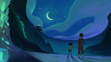 В конце мультфильма превалирует холодная гамма, «солнце» зашло и наступило время ночного полета фантазии — в буквальном смысле, ведь она активирует корабль и взлетает в поисках нового смысла.