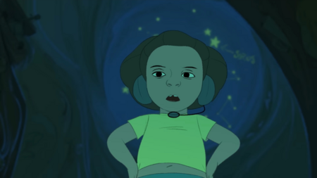 Героиня и ее детская версия часто композиционно противопоставлены в кадрах. Зрителю открывается, что раньше она хотела быть исследовательницей — и она попала в космос, но уже не так, как хотела.