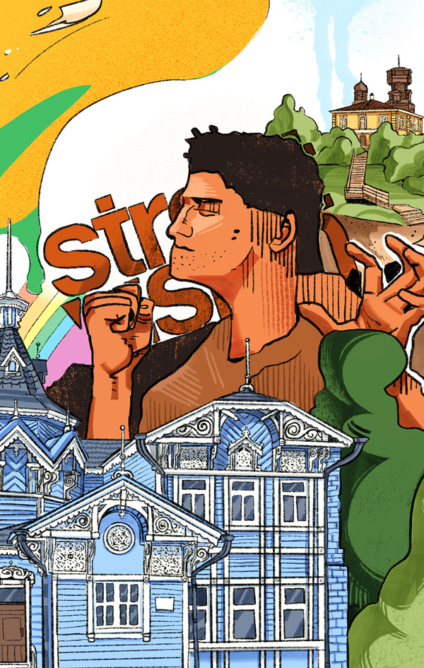 Работа по брифу издательства «Комильфо» — два разворота о своём родном городе для атласа «Города России в комиксах». В проекте принял участие 31 художник, и я был в их числе. В качестве сюжета я выбрал паранормальное детективное агентство, в котором работают Томские памятники.