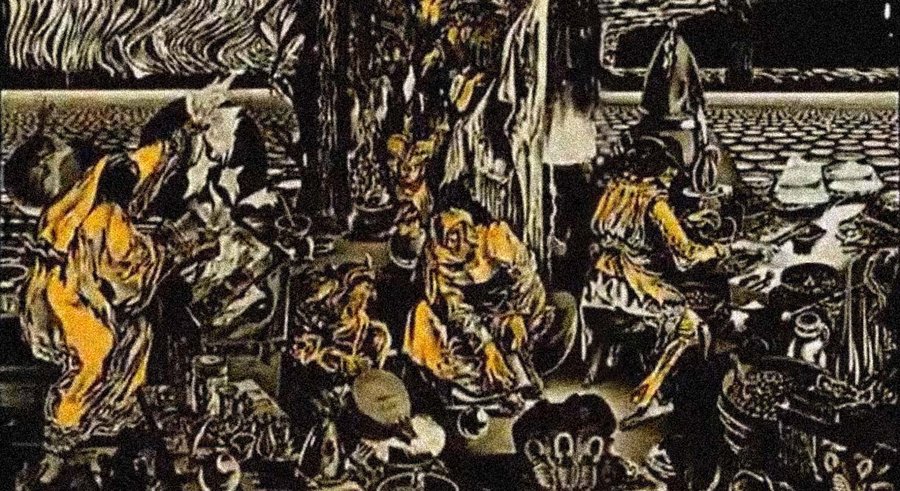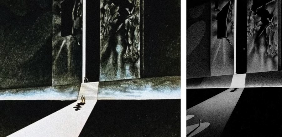 В этом кадре совмещены две работы Фоменко: на первой, согласно воспоминаниям Марко Поло, приемная мать изменника берет его отрубленную голову и пьет всю вытекающую кровь, чтобы земля ее не впитала; на второй же старая жрица открывает празднество, взмахивая палочкой. Режиссер объединяет две эти картины как бы показывая, что обретения и потери всегда стоят рядом, это предсказывает дальнейшие события мультфильма.