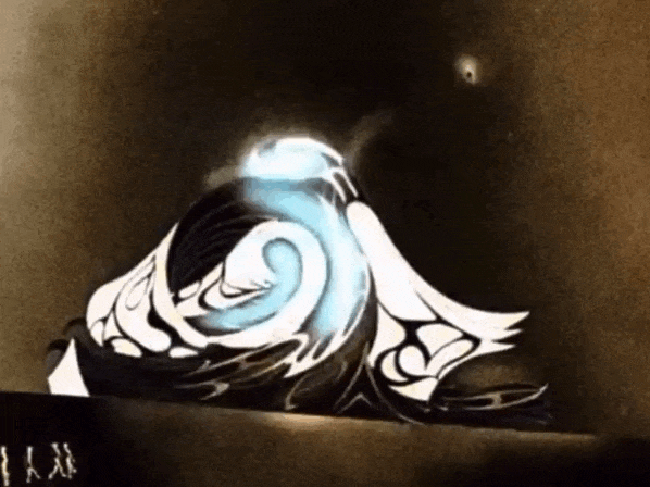 Шар в центре кадра — это бог, который иногда спускается к людям. Фоменко пишет, что смертельно опасно попасть в тень этого шара, однако мы видим, что путники проводят много времени прямо под ним, разводя костер.