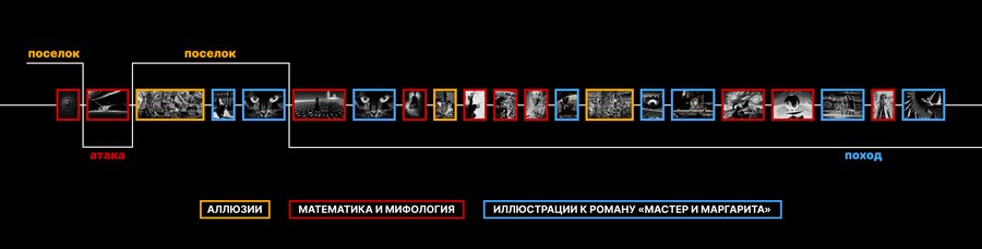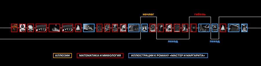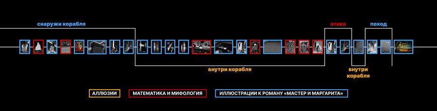 В этой работе Фоменко иллюстрирует два похожих сюжета: в «Мастере и Маргарите» счастливые солдаты покидают Голгофу, а в мифах Атлантики и Испании заканчивается праздник жертвоприношения и флотилии кораблей покидают храм до следующего года. Таким образом, Фоменко сообщает зрителю, что герои мультфильма точно вернутся к космическому кораблю (как и солдаты еще не раз придут казнить кого-то, а жрецы — совершать свои ритуалы).