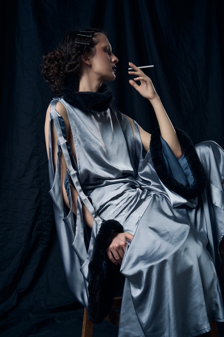 Коллекция создана в рамках коллаборации с MAAG, изделия изготовлены с использованием техники апсайкла из предоставленных материалов. Принцип устойчивой моды актуализируется в том числе за счет концепции: одежда для контрабанды тоже редко делалась с нуля, чаще перешивалось уже готовое платье.