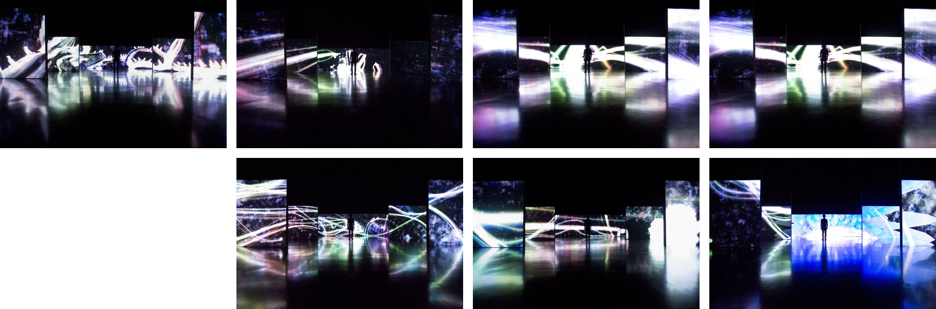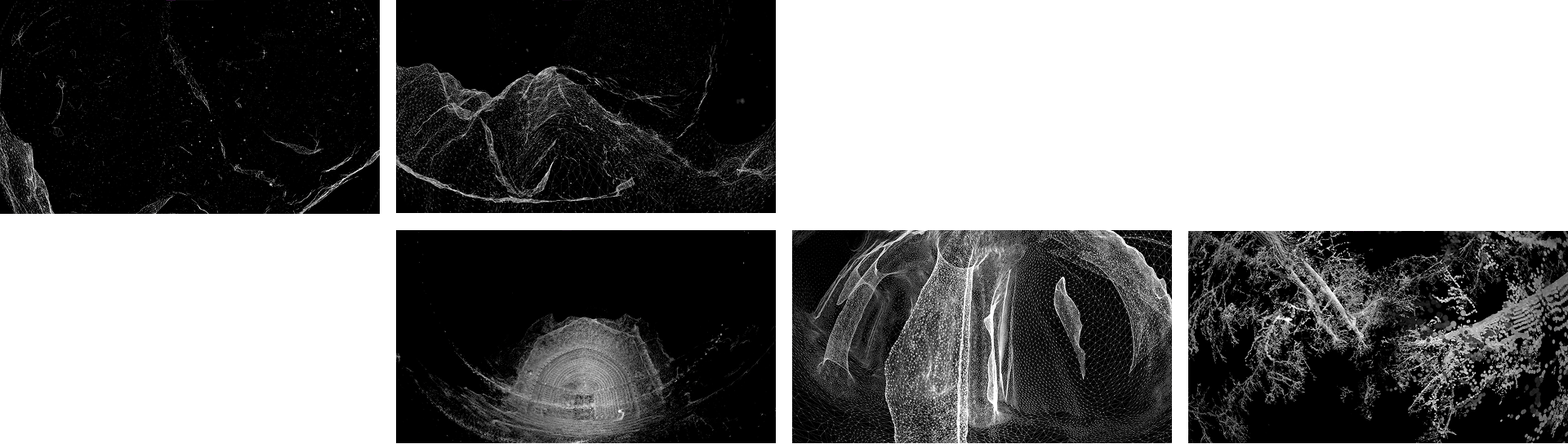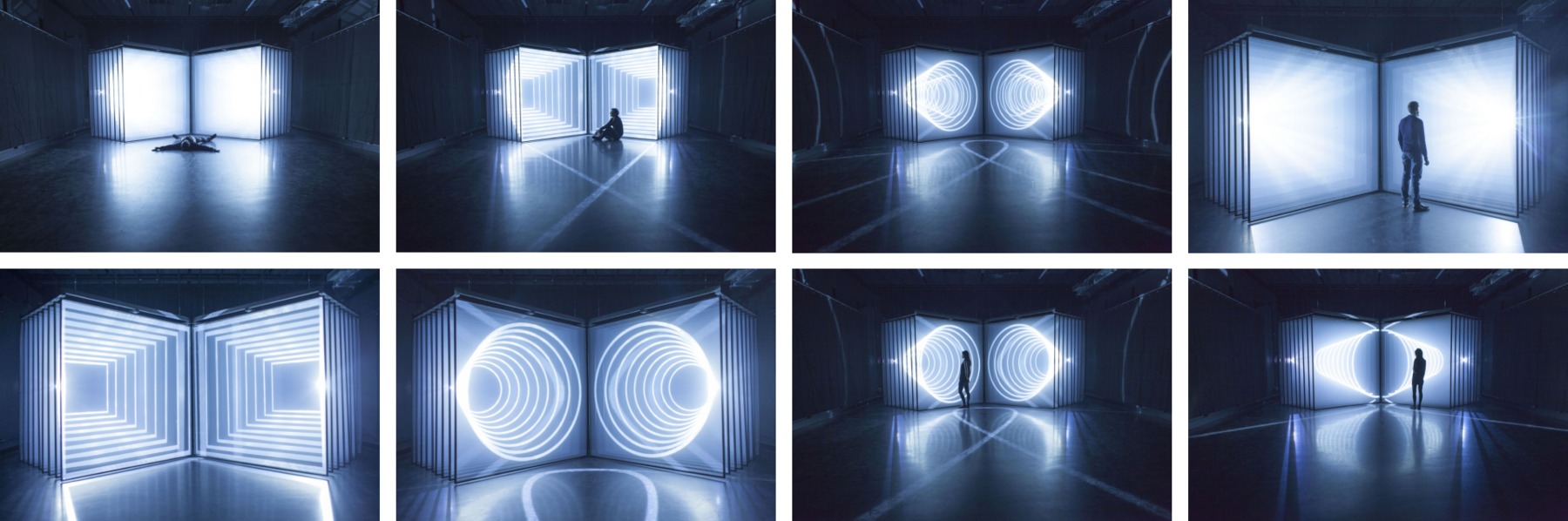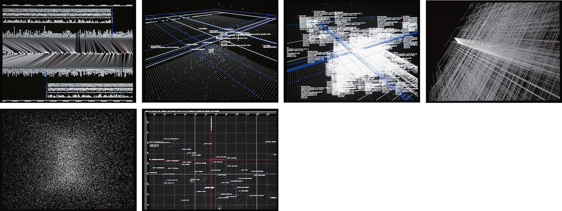 Alva Noto, кадры серии «UNIEQAV», 2018; «HYbr: ID», 2021-24 // Nonotak Studio, фотодокументация проекта «DAYDREAM V.2», 2016 // М. Фелл, фотодокументация проекта «Recursive frame analysis», 2015.