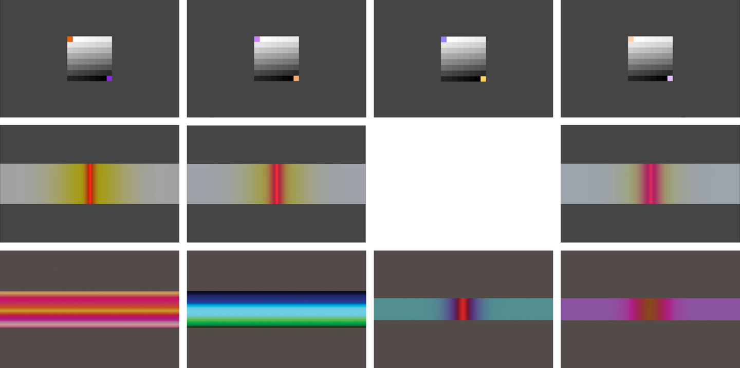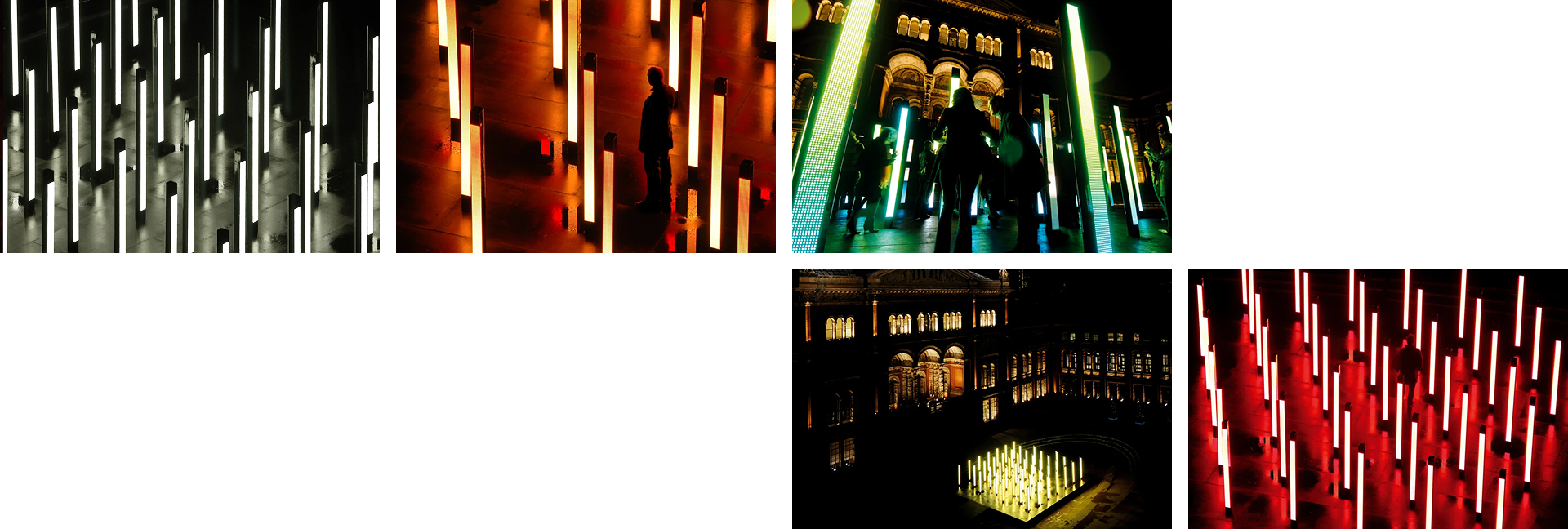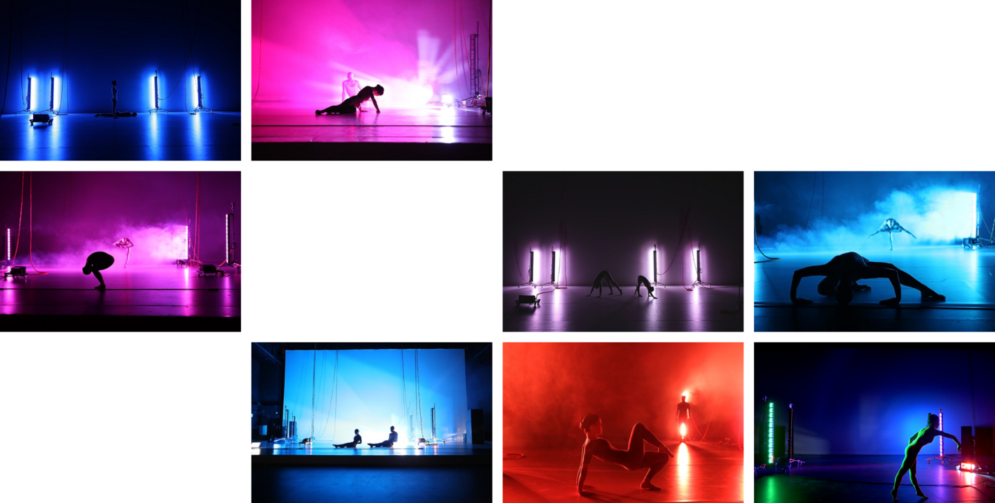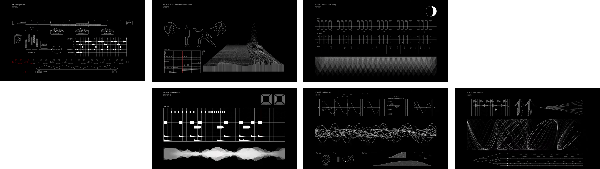 Alva Noto, кадры серии «UNIEQAV», 2018; «HYbr: ID», 2021-24 // Nonotak Studio, фотодокументация проекта «DAYDREAM V.2», 2016 // М. Фелл, фотодокументация проекта «Recursive frame analysis», 2015.