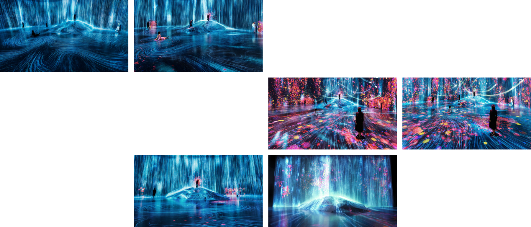 Д. Манабэ, «Continuum Resonance», 2024; «Sensing Streams», 2014 // Ж. Лемерсье, кадры «Nimbes», 2014 // TeamLab, «Universe of Water Particles…», 2013; «Crows are Chased…», 2017.