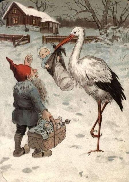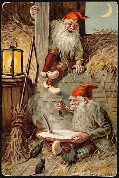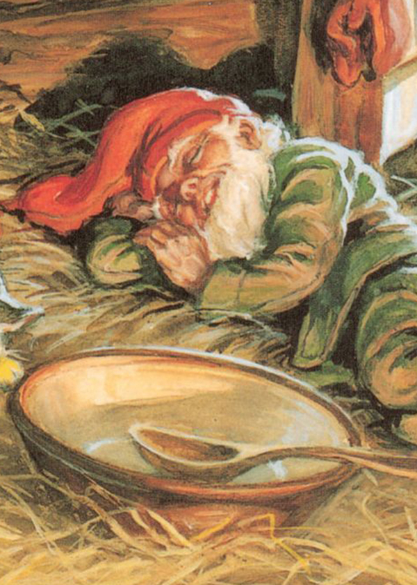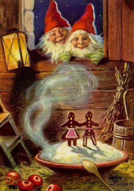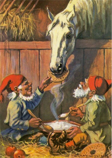 Иллюстрации с такими гномами очень уютные, теплые. Много поколений детей выросли на открытках и книгах с участием домового именно такого, каким его увидела Йенни Нюстрём.