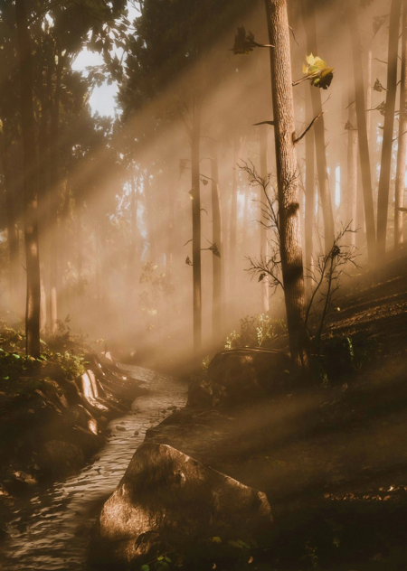 Мягкий розовый свет вечернего или утреннего солнца задаёт настроение лесу на заднем плане, туман же очерчивает линию горизонта и словно является продолжением неба, его прикосновением к земле. На обоих скриншотах деревья позади стоят в относительной близости друг к другу, соблюдая важный для леса-родственной души баланс — они недостаточно обособлены, чтобы выглядеть отчуждёнными и безучастными, но в то же время небольшая дистанция между ними позволяет лучам пронизывать воздух, что делает лес приветливым и открытым.