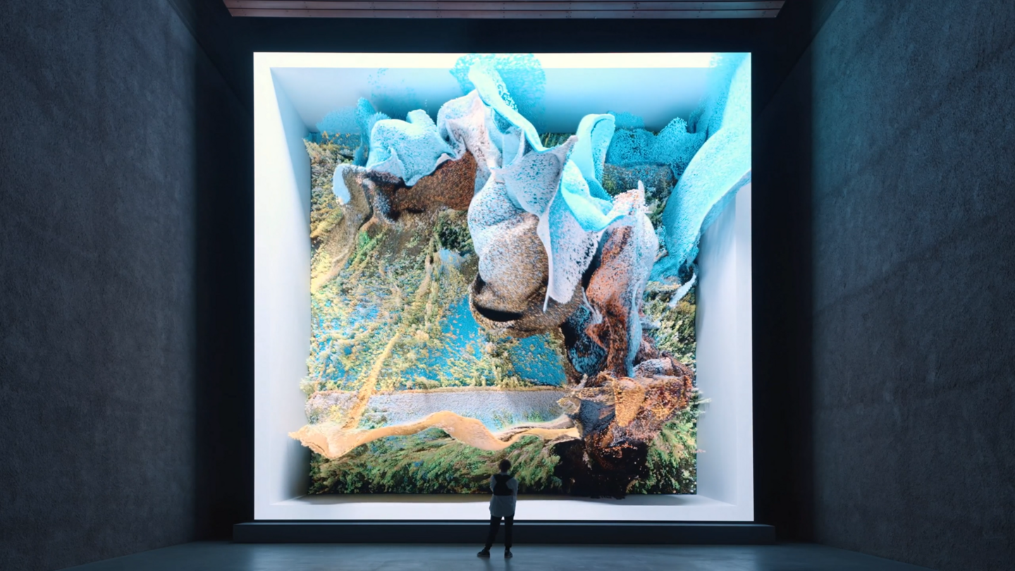 Описание: Работа представляет собой иммерсивную проекцию цифрового водопада, созданную с использованием физических симуляций потока жидкости. Звук водопада синтезируется на основе параметров визуальной симуляции: сила потока, плотность частиц и столкновения влияют на аудиосигнал.