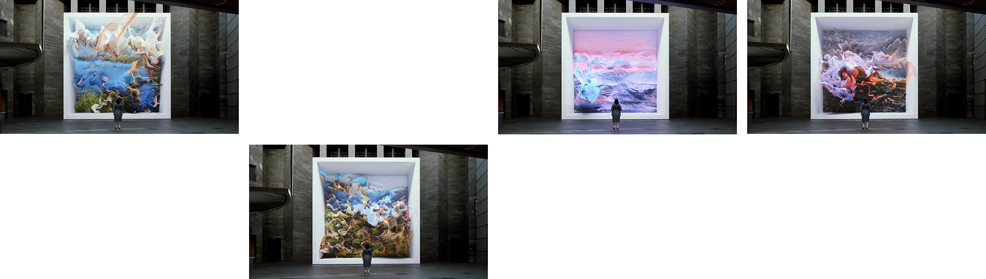Визуализация: На больших LED-поверхностях возникают текучие абстрактные структуры, напоминающие природные рельефы: медленно смещающиеся волны, слоистые поверхности, плавные деформации. В отличие от более ярких и многослойных проектов Анадола, здесь палитра минималистична, что переносит акцент на фактуру движения и создает ощущение материальной глубины [68-70].