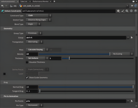 В проекте ВКР основным материалом ткани в одежде персонажей являются домотканые лен, тонкая шерсть и конопля — тонкие, но довольно плотные по структуре. Чтобы ткань не разлеталась слишком хаотично, ее частично закрепляем у пояса при помощи констрейнов Vellum Attach.