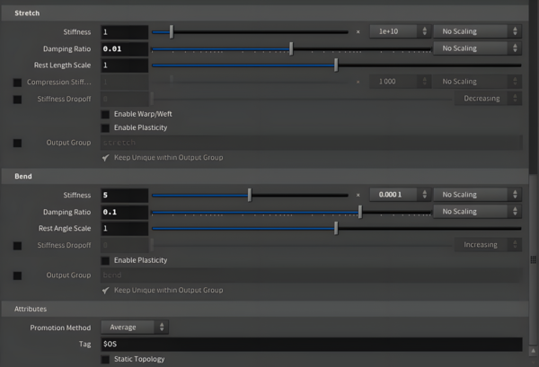 Параметры ноды Vellum Constraints предназначены для настройки внутренних сил мягких тел (в нашем случае — ткани). Характеристики объекта можно изменить с помощью настроек жесткости и демпфирования. Параметры жесткости регулируют силу, с которой ткань сопротивляется деформации (растяжению для Stretch и сгибу для Bend). Параметры демпфирования управляют тем, как быстро ткань теряет энергию в процессе деформации.