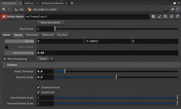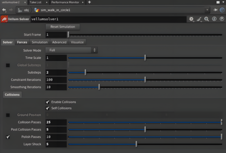 Повышаем качество коллизии, увеличив значения Collision Passes, Polish Passes и Layer Shock. Во вкладке Forces солвера повышаем Velocity Damping до 0.05, чтобы избежать нежелательной ряби симуляции.