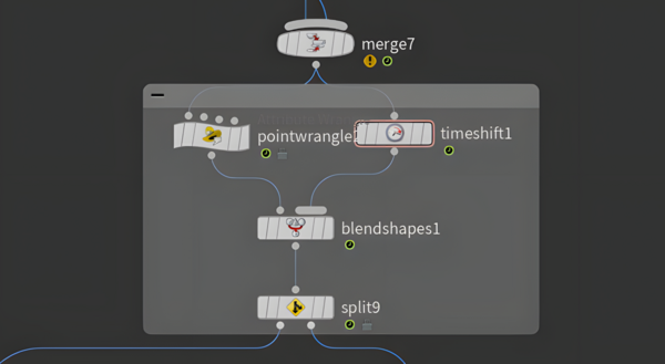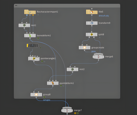 Так как симуляция затрагивает исключительно юбку, а верхняя часть платья является частью общего скина, необходимо аккуратно соединить обе части одежды. Для этого выделяем ограниченную швами группу точек и соединяем их нодой Fuse.