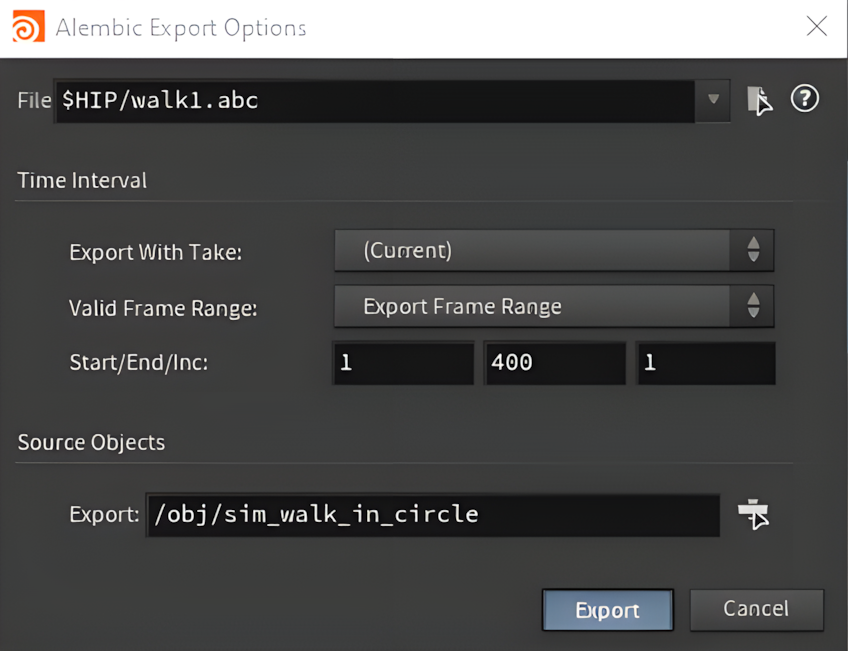 Полученный результат экспортирован в формате Alembic для дальнейшей загрузки в готовую сцену в Unreal Engine. Обязательно указывается ссылка на источник в OBJ-контексте.