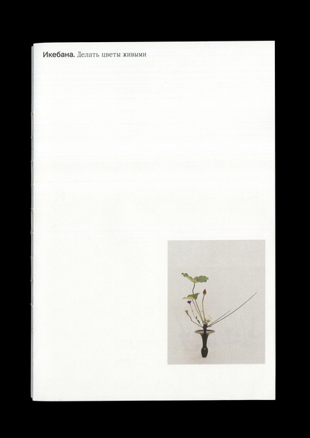 Дизайн книги отражает несколько принципов икебаны. Первый приницип — ассиметрия, сетка поделена на 9 колон, что смещает центральную линию и делает вёрстку ассиметричной. Второй аспект — «ма». Этот японский концепт гласит, что часто пустое или незаполненное гораздо важнее заполненного. Благодаря неплотной бумаге (100 гр/м2) контент с других страниц виден и на раскрытом развороте, это создаёт интересные композиции и добавляет глубину книге.
