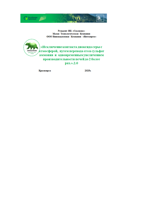 Краткое описание Вашей деятельности: Проект обеспечивает закрытую утилизацию диоксида серы без контакта с атмосферой, вдвое повышает производительность печей, и выручку исключает затраты на производство серной кислоты, снижает газовую нагрузку и позволяет сульфат аммония