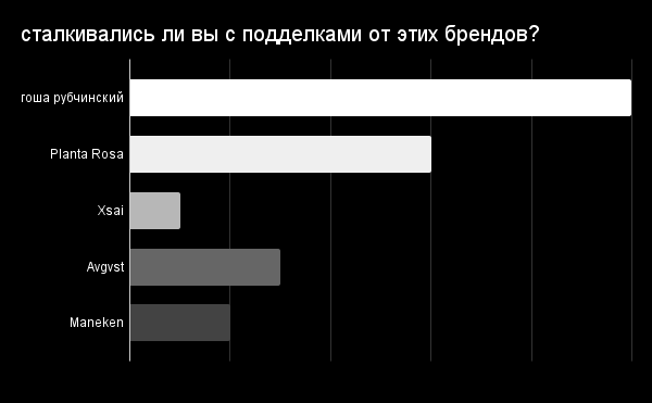 проведя исследование количества подделок на маркетплейсах и социальный опрос среди потенциальных потребителей, мы пришли к выводу, что такие бренды как ГОША РУБЧИНСКИЙ и Planta Rosa выделяются на фоне остальных брендов, так как имеют бо́льшую популярность. количество подделок у этих брендов значительно превышает подделки менее популярных, вне зависимости от ценовой категории бренда. узнаваемость бренда так же увеличивается вместе с количеством продаваемых подделок.
