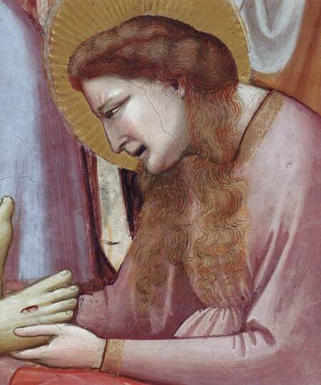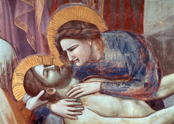 Для скорбящей Марии у Джотто особенный язык. Она глубоко наклоняется над Сыном, прижимает его к себе так близко, как может только мать. Она обнимает его обеими руками и вглядывается в его лицо.