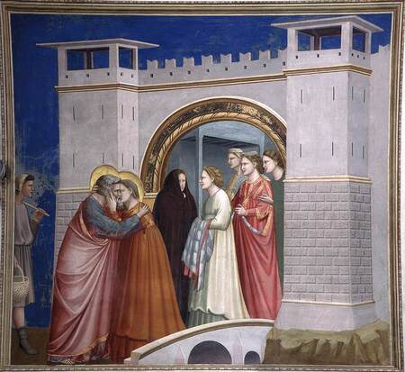 Слева: Джотто. Бракосочетание Марии. Фрагмент. Справа: Джотто. Встреча у золотых ворот. Фрески в Капелле Скровеньи в Падуе, Италия, 1303–1305 гг.