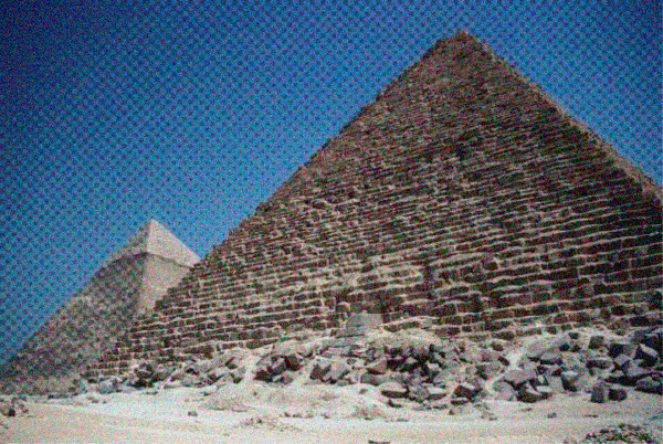 слева — комплекс пирамид Гизы справа: сверху — фрагмент Абидосских иероглифов внутри храма Сети I снизу — рельеф «Дендерский свет» в храме Хатхор
