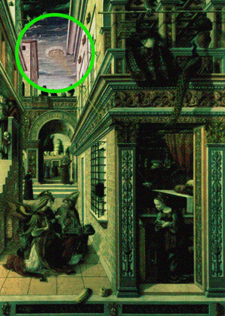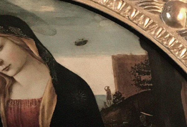 Сегодня Мадонну можно увидеть во Флоренции в Палаццо Веккьо. Если приглядеться, в правом верхнем углу над Марией можно отчетливо распознать объект в форме диска. Официальная версия звучит так: объект в небе — это «светится облако» или «ангельская слава», изображение божественного присутствия. Но взгляните вниз, там изображен мужчина, пастух, который приложил руку ко лбу, чтобы защититься от яркого света, и в изумлении смотрит прямо на этот объект!